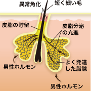 ニキビは、脂腺性毛包という種類の皮脂分泌を行う毛穴に発生します。角栓によって毛穴の出口が塞がれることから始まり、最終的には内部が炎症を起こして美容面にも悪影響を及ぼすニキビ。一般的な治療法は対処療法にとどまっており、ニキビそのものが発生しないようにするわけではありませんので、ある意味、難治性の皮膚疾患であるという認識が必要。抜本的解決を目指す場合、ホルモンバランスを是正する治療がもっとも高い効果を期待できるでしょう。